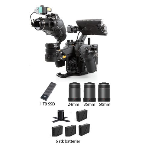 Prisen inkluderer kamerahus og 3 batterier (v-mount), regntrekk, mattebox, 2 minnekort (CFast 2 128GB & 64GB), kortleser og lader.