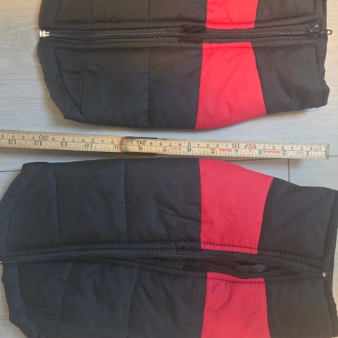 Jakke i parkas-stil med pelskrage til liten hund, type chihuahua eller liten valp. Prøvd på, men ikke brukt da den var litt liten til medium pomeranian