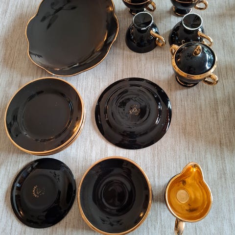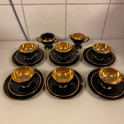 Flott mokkaservise i sort/gull fra stavangerflint og porsgrunn. 6 kopper, 6 skåler, 6 fat, sukkerkopp, fløtemugge, 2 kakefat, 2 askebeger og en and...kr 1400