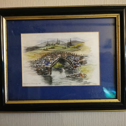 Akvarell av Astri Tønnesen 1986. Motivet heter "Utsikt mot blånene". Glass og gullforgylt ramme. Rammen er hel og fin med noe bruksslitasje. Selve akvarellen måler ca 40 x 28 cm og har ca 4 cm passepartout. Rammen måler ca 50 x 40 cm. Bud mottas.