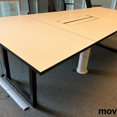 Ett stilig og solid møtebord i mørk grå utførelse. 2stk luker og krybber til kabler. Mål: 420cm x 120cm
