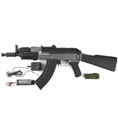 Magasinet er også laget av metall og rommer hele 550 skudd! Enden av løpet har 14mm CCW gjenger til feste av diverse lyddempere og flammefordelere. Løpet har gjengebeskytter. Rifla er både semi og full-auto, har vanlig mini tamiya plugg og batteriet sittes inn i kolben. På innsiden av rifla finner man en versjon 2 gearbox og lang motor. Det medfølger reim.