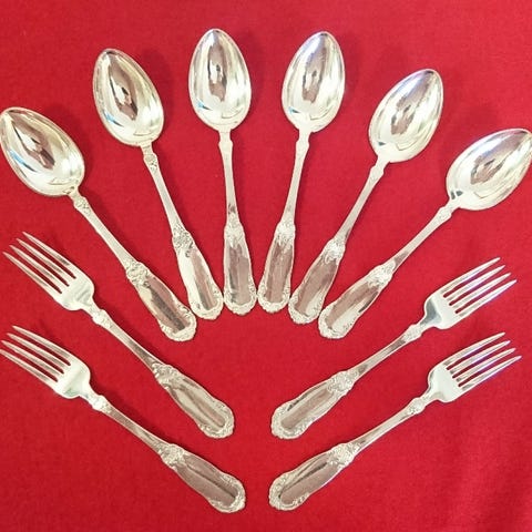 5 SKJE 18 (4 MED GRAVERING)OG 3 STK. 19 CM LANGE I MØNSTER VASA. 10 STK GAFFEL 18 CM OG 5 STK GAFFEL 19 CM LANGE. SELGES FOR KR 25 PR DEL, ELLER SAMLET FOR KR 350,-.