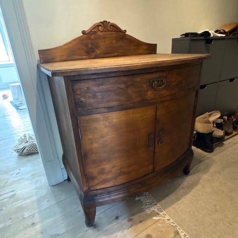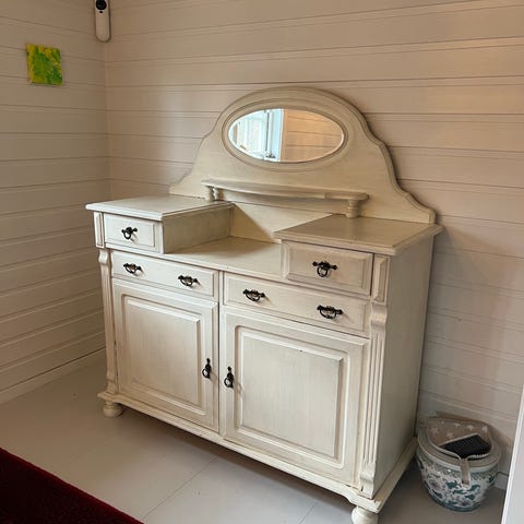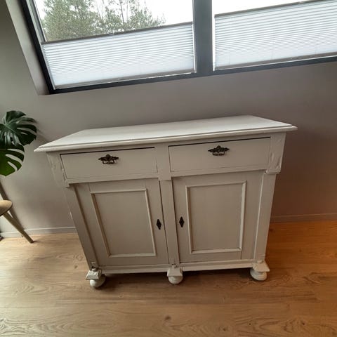 Gammel kommode med fine detaljer selges. Den har en skuff og 2 dører med en hylle. Den er malt hvit en gang, som er noe slitt bort enkelte steder. Men det gjør den litt sjarmerende.