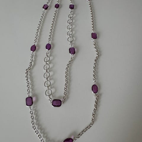 Langt kjede fra Celine Engelstad i sølv, med perler og stener. Brukt kun et par ganger. Kan brukes på mange forskjellige måter og også deles opp som armbånd.