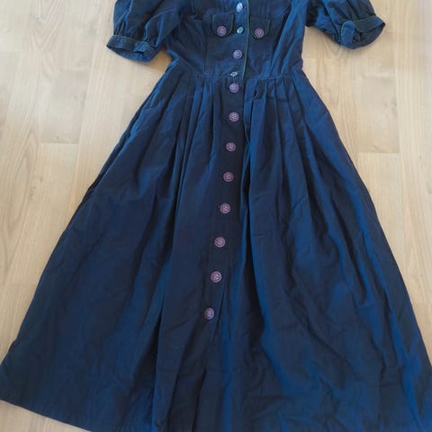 Sort merkekjole i smal cordfløyel fra Shubette of London. Size 10. Str.36. Med pene detaljer. Livvidde 76 cm. Bryst 44 cm *2. Lengde 110 cm. Made in England. 100% bomull. Røyk- og dyrefritt. Kjøpt 1980’s. Sitter pent. Høy nypris. Nesten ikke brukt. Som ny. Selger kr.1.800,-. Pris er satt.