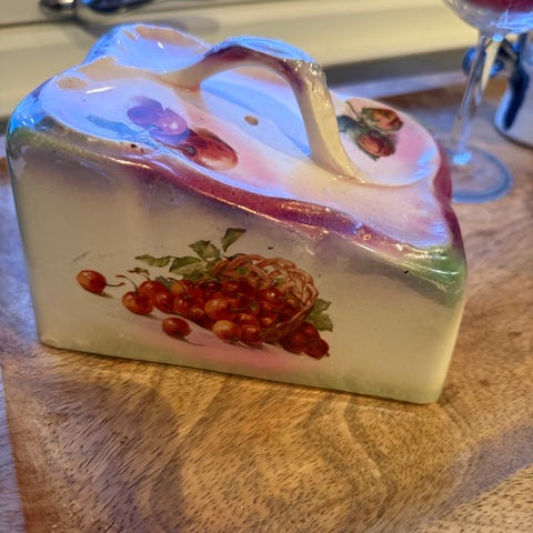 Gammel og nydelig osteklokke uten nag. Noe krakelering, men er vel ikke rart etter mange år. Fatet er 20cm langt og høyden på klokka på det høyeste er 10cm.