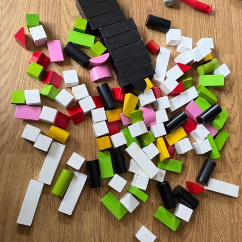 Byggeklosser i tre i forskjellige farger og former, lite brukt.