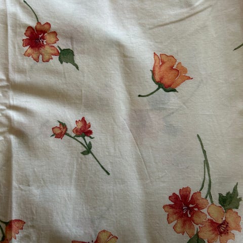 Pene gardiner i stoff fra Apple. Foret. Høyde 140 cm, bredde 127 cm. Kappe 264 lang, høyde 28 cm. Litt falmet i sidene, men ikke problem å sy de inn litt. kr. 250,00 for begge