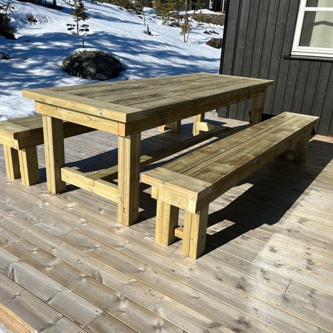 Dette er en solid benk som er laftet oppå hverandre. Benken kan enkelt monteres av to personer, og tyngden i tømmeret gjør at den ligger stødig. Men blir oftest montert med konstruksjons skruer i bordplater og benkeplater for stødigere montering. Benken er ikke pusset eller behandlet. Det anbefales at benken blir behandlet om den skal så ute i vær og vind. Jeg kan både levere den ferdig pusset og behandlet i ønsket farge og beis men med et pristillegg. Barnebenker kan også lages i samme type om det ønskes.