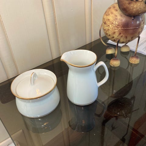 Sett med fløtemugge og sukkerskål fra Porsgrund porselen stemplet 1949-1952.