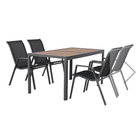 Spisestuen har pulverlakkert 100% aluminiumsramme som gjør bordet og stolene lette og enkle å flytte rundt. Bordplaten er av herdet glass som er enkelt å rengjøre. Takket være det sterke textilene-stoffet er stolene værbestandige og enkle å rengjøre. Stolene kan lagres praktisk under bordet for å spare plass når de ikke er i bruk.