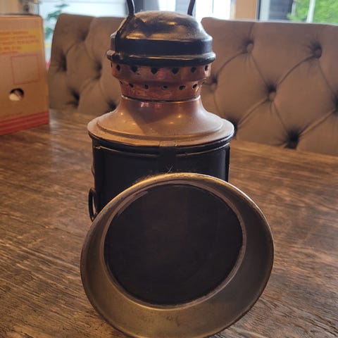 Skipslanterne med rødt glass. Alder er ukjent. Ca 21 cm bredd og ca 50 cm høy.