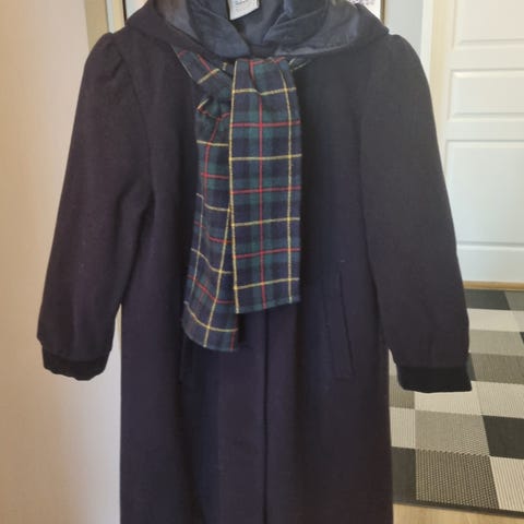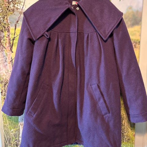 Pent brukt klassisk kåpe med mørkegrønn krave og mansjetter på armene.