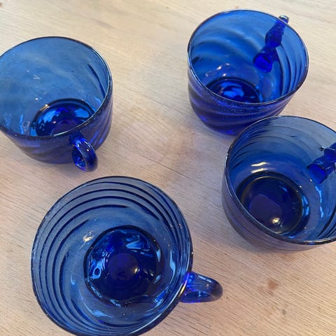 5 flotte, store krus i en vakker blå glasur selges 100kr pr stk + porto.