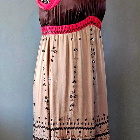 TSH brun kjole i silkechiffon, bronze frynser i plast. overdelen sydd med strikk og halterneck knyting.