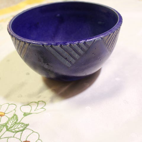Stor keramikkbolle fra 1975, med sju dessertskåler. Den ene av disse har et lite hakk i glasuren.