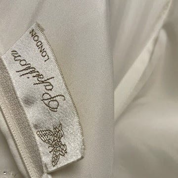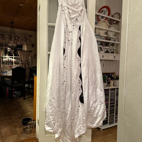Brudekjole fra Forever Yours, farge Ivory. Str. 40-42, men er fleksibel pga. snøring i ryggen. Jeg er 178 cm og hadde lave sko. Kjolen har perlebord øverst på bysten, langs sømmen ned på siden, samt langs sømmene midt på ryggen og videre helt ut bak på kjolen. Kjolen har et kort slep. Brukt 1 gang. Renset.