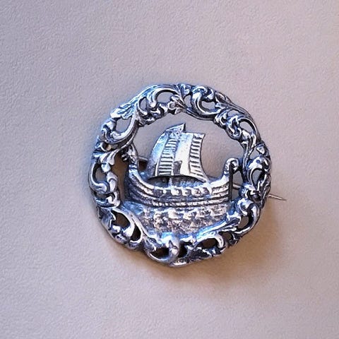Nydelig brosje i sølv og emalje, Vikingskip