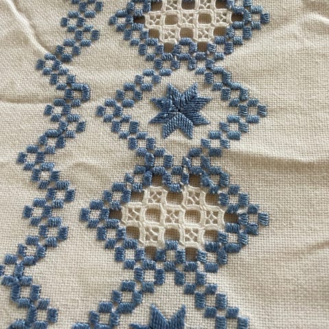 5. Redesign? To små hull. Praktfullt broderi, vaffelstoff, bomull. 51*58. Kr 100