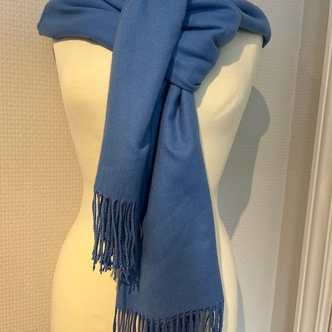 Stort fint ull skjerf i blått. Det är en liten missfärgning på skjerfet, syns inte så mycket som på bilden.