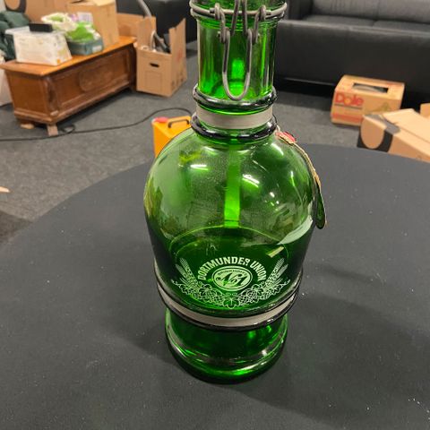 Stor gammel spesiell ølflaske med lite krus selges.