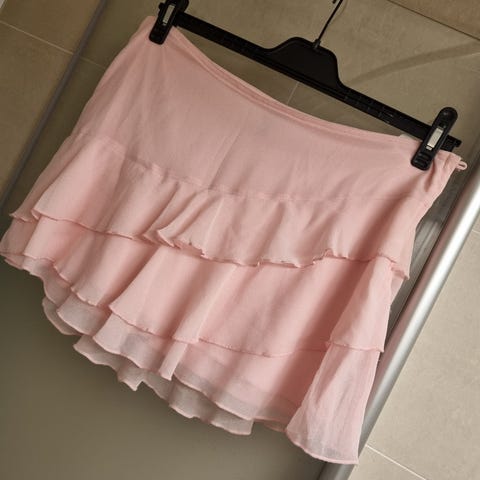 Det er et lekkert, helforet selskapsskjørt, i ren rosa farge. Fargen på bildet er misvisende. Hvis du blar videre og ser neste bilde så ser du mer fargen. Det er en pen rosa farge.