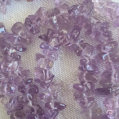 Nydelig halssmykke av ekte ametyster og perlemor selges. Lengde 56cm. Vekt 113g.