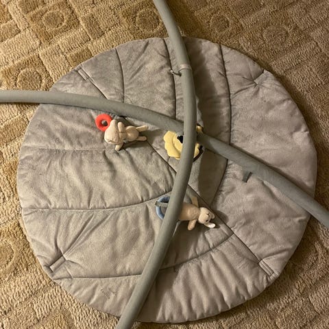 Babygym, 1,07x1,07m. Mangler et lite hjørne, og en liten sirkel, ellers komplett.