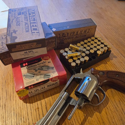 4 magasin med lader. Safariland hylster. Mad Dog (?) hylster. 5 mag.holdere (3 Safariland) Belte.