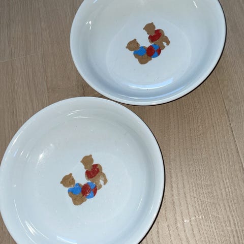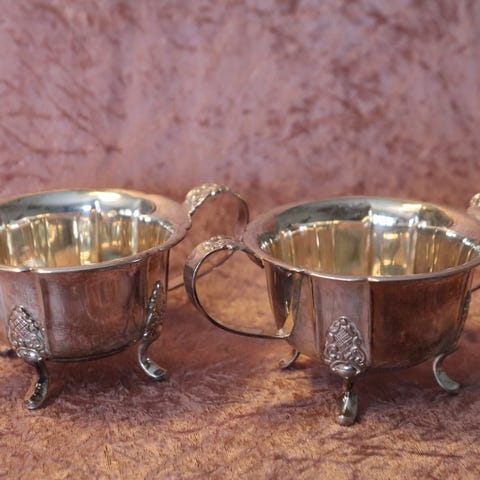 Brukte barnesko som ble forsølvet. Kan brukes som pynt og små vaser da det er glass oppi dem som følger med. Gi gjerne bud