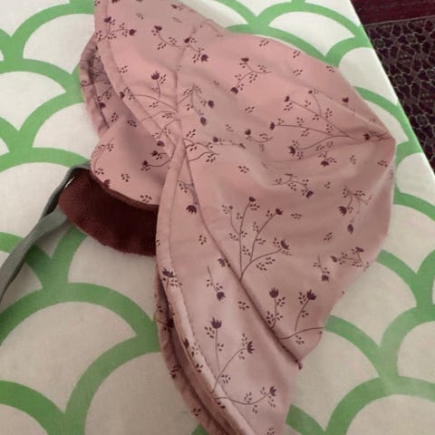 Ny håndlaget kyse/lue laget av kvalitets stoff fra Liberty. Str 1 år. Har også i str 3 og 6 mnd. Og i andre stoff. Selger også hårsløyfer med strikk i samme stoff. Kan sendes mot porto