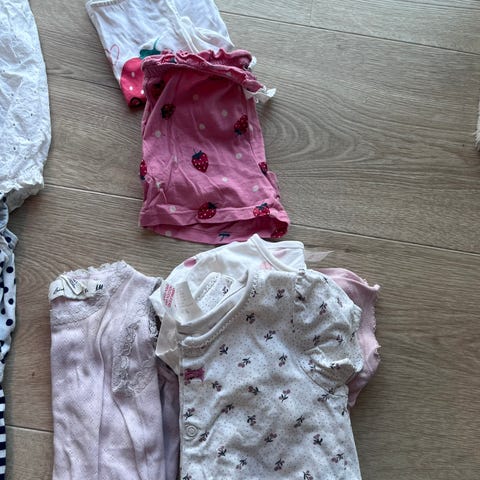 En strikket kjole, tre langermede bodyer, en bukse, en sparkedress u/bein, en pysj og to par ullsokker. Hbo 250kr. Kjøper betaler frakt.