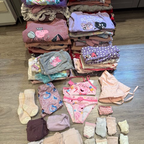 En Guess-kjole, en cardigan, en hettejakke, syv strømpebukser, fire langermede bodyer, to kortermede bodyer, fire bomullsbukser, en joggebukse, en sparkedress, en playsuit og tre pysjer x2. Hbo 400kr. Kjøper betaler frakt.