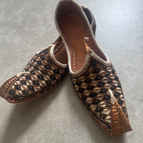 Selger tradisjonelle orientalske håndsydde sko fra Marokko. Både utside og innside er i skinn.