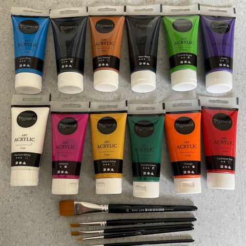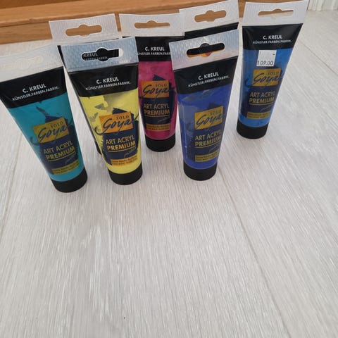 Selger helt nye akrylfarger av høy kvalitet i 6 forskjellige farger i størrelse 30 ml pr tube.