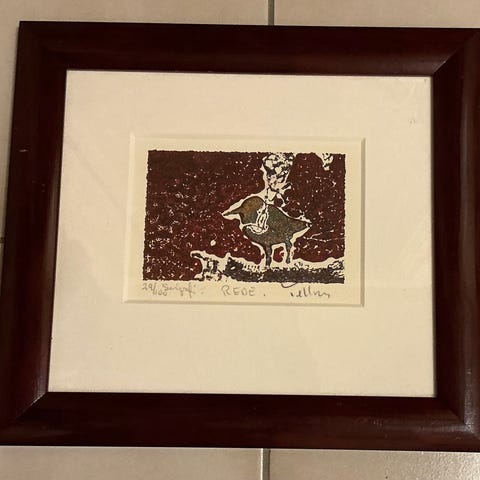 Kjøpt i kunstbutikk i St Emilon. Svært pent innrammet med utsøkt fargebalanse mellom motiv og detaljer i rammen. Veldig fin stand. Selges for 3000 kr.