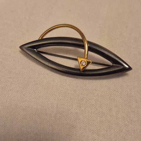 En spesiell nål. Sotet sølv. Lekker på et bluse- eller jakkeslag eller rett og slett på en høyhalset genser. Trenger en puss da den ble liggende ubrukt i lang tid. Har arvet den og tenkte alltid at denne må jeg bruke og det ble med tanken. Nå håper jeg noen andre kan ha glede av den. Er ikke sikker på den lille stenen foran, men den funkler pent. Ingen skader eller merker. Men som sagt en puss er påkrevet.