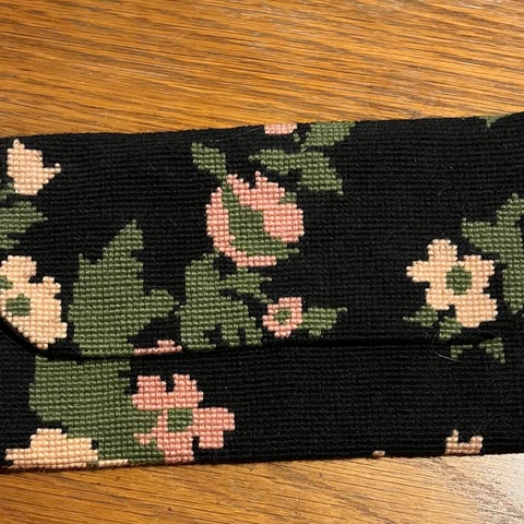 Nydelig, brun fløyelsveske med trehåndtak og utsøkte perlebroderier.