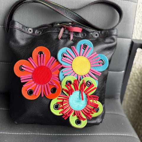 Nydelig håndveske i stoff og skinn, med lekre pyntedetaljer.