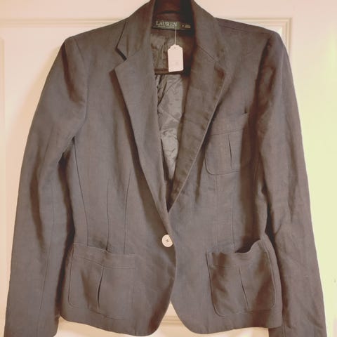 Svart glatt nokså blankt ytterstoff i 56% polyester 38% bomull 6% metall. Foret med beige stripet stoff i 100% acetat.