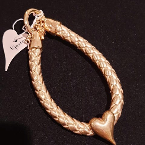 Langt gullfarget halskjede med gullfargede hjerter.