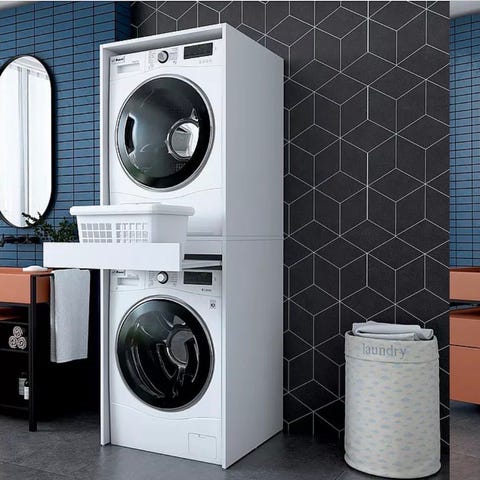 Kjøp billig Stablesett for vaskemaskin med utrekkbar hylle. Dette høykvalitets stablesettet vil hjelpe deg til å bygge en kolonne mellom vaskemaskin tørketromme. Veldig praktisk!