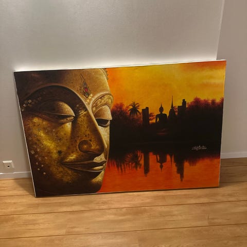 Bilde 1 og 2: Håndmalt bilde (91x91cm) kjøpt i Thailand og rammet inn i Trondheim selges kr. 300.