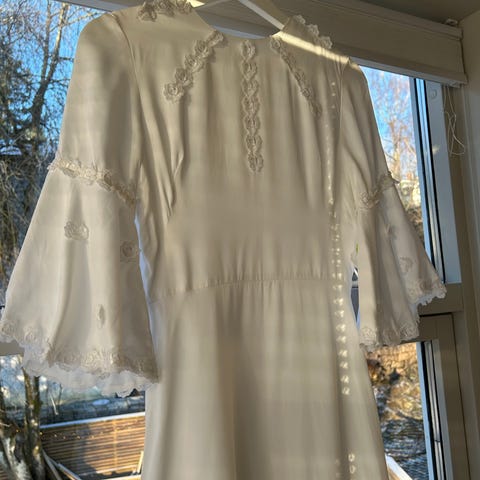 Elegant kjole med slep, i 60/70-tallsstil. Blonder nederst.