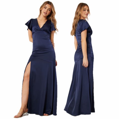 Modellen på bilder er 168 cm høy. Kjolen heter "Samantha". Den har en flott blåfarge i marine og glidlås i ryggen. Oversiden på ermene har et åpent snitt som gjør den mer elegant og mindre "tantete". Nypris 2290 kr