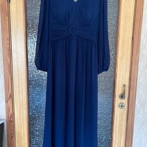 Modellen på bilder er 173 cm høy. Kjolen heter "Samantha". Den har en flott blåfarge i marine og glidlås i ryggen. Oversiden på ermene har et åpent snitt som gjør den mer elegant og mindre "tantete". Nypris 2290 kr