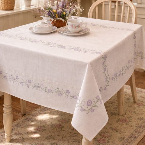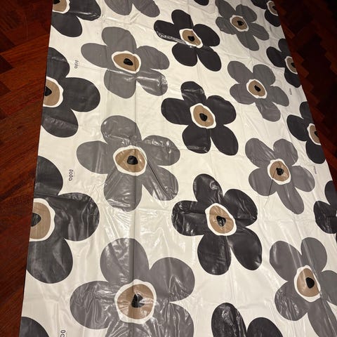 På bildene ser du skrukkene som kommer av at duken er laget med strikk og pakket, disse kan du stryke ut med svak varme og med et håndkle i mellom jernet og duken.
