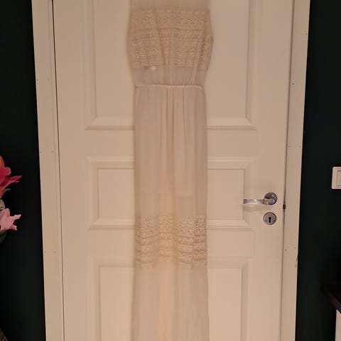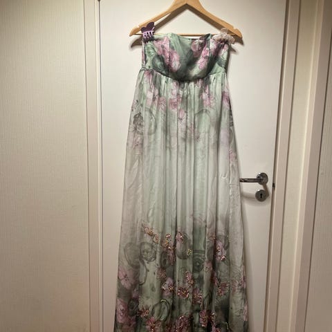 Nydelig kjole fra Moods of Norway, med flotte detaljer rundt livet. Åpen rygg og glidelås på siden for en perfekt tettsittende form rundt brystet. Laget i 100% silke. Str 36. Brukt en gang, fremstår som ny.