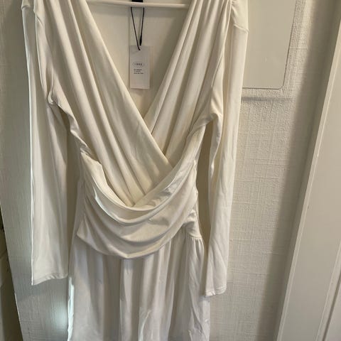 Langermet kjole med V-utringning. Rynket snitt i kanten med volang nederst. Lukning foran med knapper.